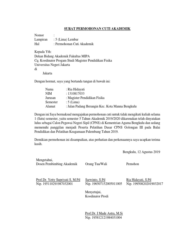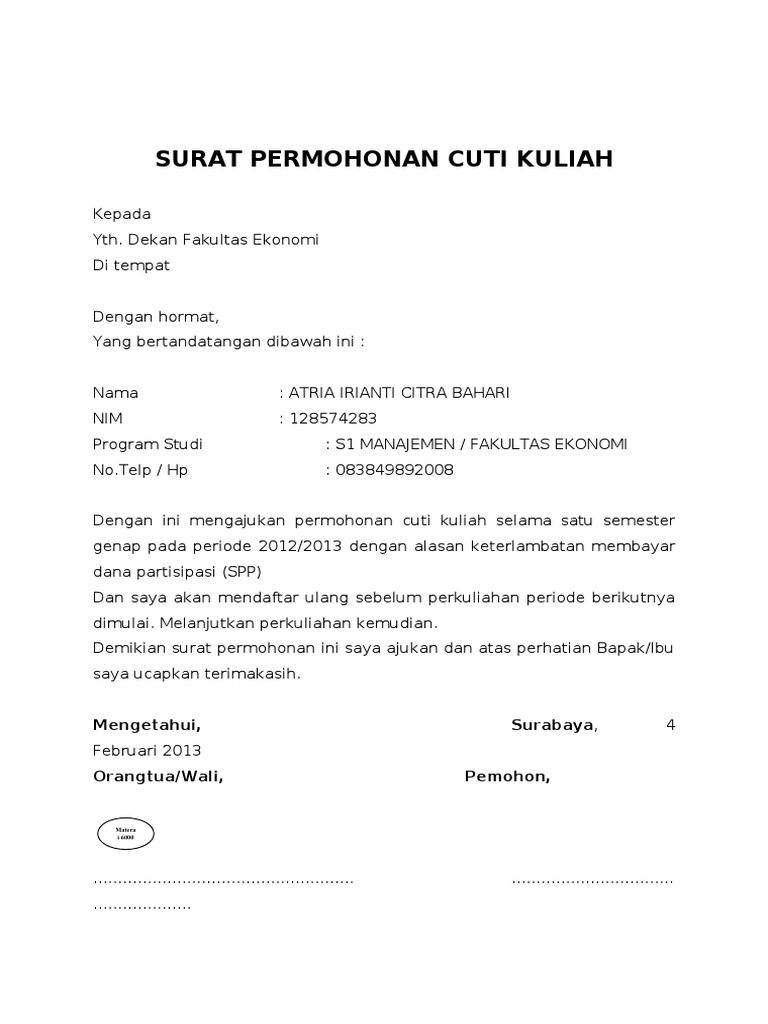 Contoh Surat Cuti Kuliah 1 Semester Otosection